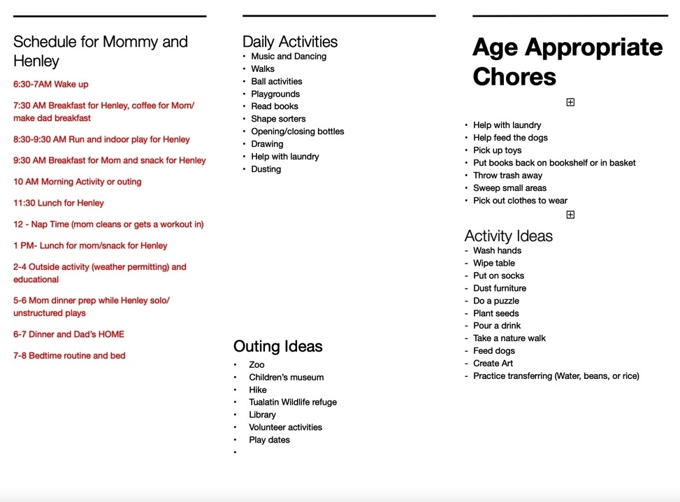 As of this post, my daughter is only 14 months old and I have just recently started this new routine now that I am at home full time. That being said, the routine may change in the next year as she grows and we work out any kinks in the current schedule that I am not aware of. Also, I have some items listed in the age appropriate chores and activities that are more geared towards a 2 year old but, as any parent knows, that time will be here before I know it so I am just getting prepared!