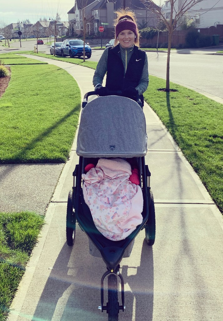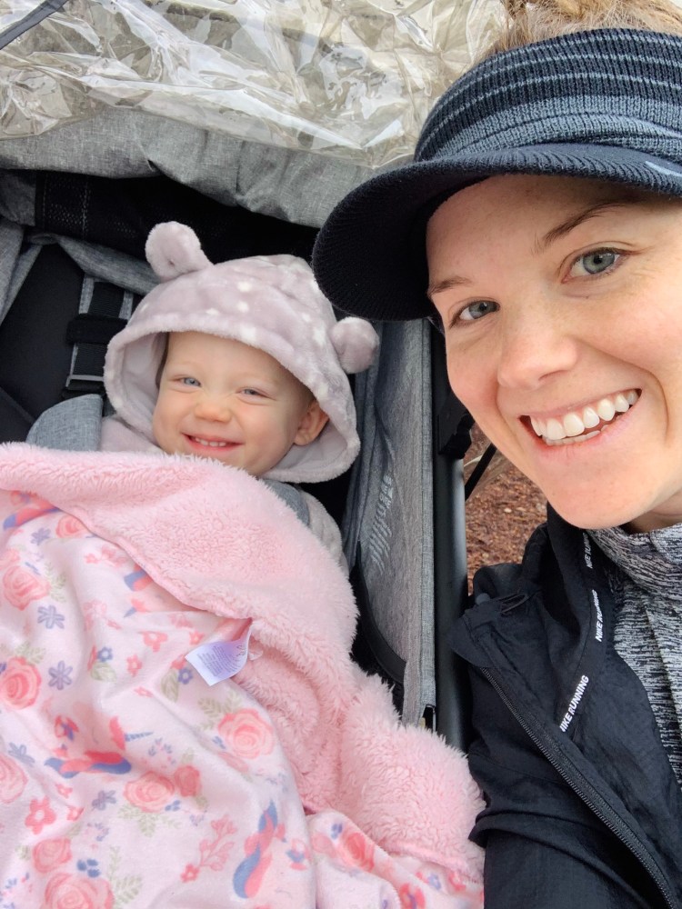 Adding my daily run into the routine was important for me as that is the one constant workout I have been able to incorporate while at home with my daughter. Since we invested in a good jogging stroller (we use the BOB Allterrain Jogging Stroller), I have been able to get out on runs with my daughter in tow and not worry about trying to fit a workout into her nap times or early in the morning. Although, the days I can add a workout in are bonuses! I also bought a rain cover so I can get out in any weather, we’ve ran in the rain, snow, and wind! The wind is another story though, that can be pretty tough no matter what you have prepared for. My daughter also enjoys our daily runs and will even nap on occasion while we are out. If you start them out on daily walks when they are young enough, they should be ok in the stroller as they get older. Trust me, my daughter does not like being contained, but as soon as the stroller starts to move, she is content.