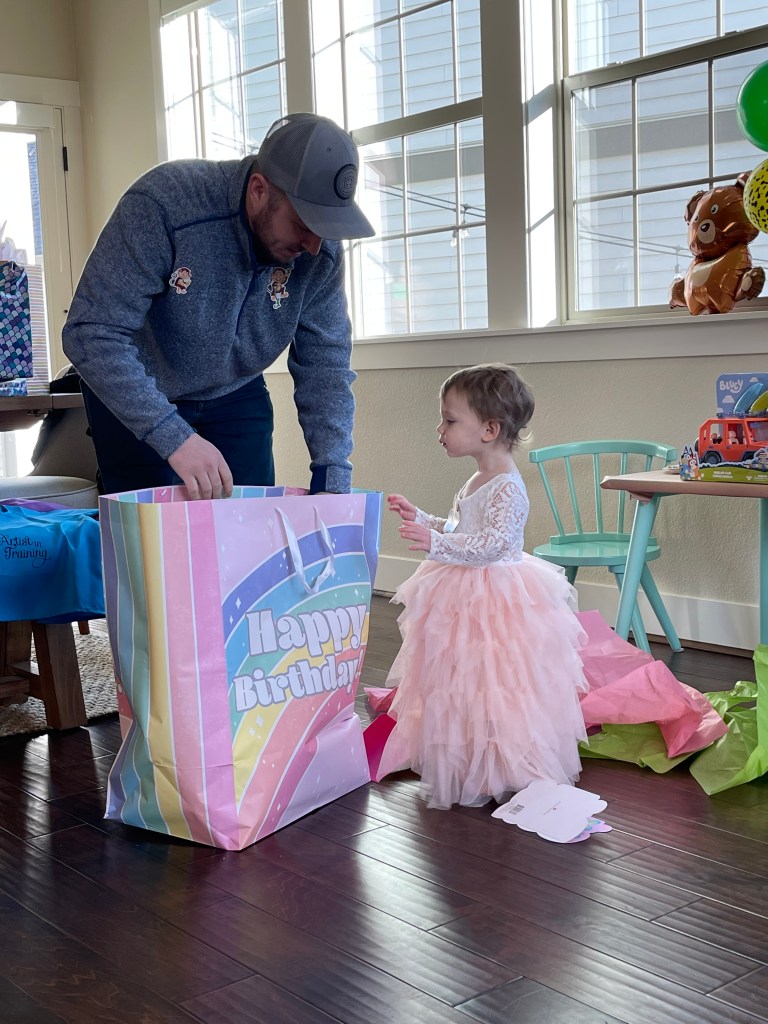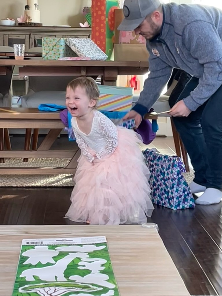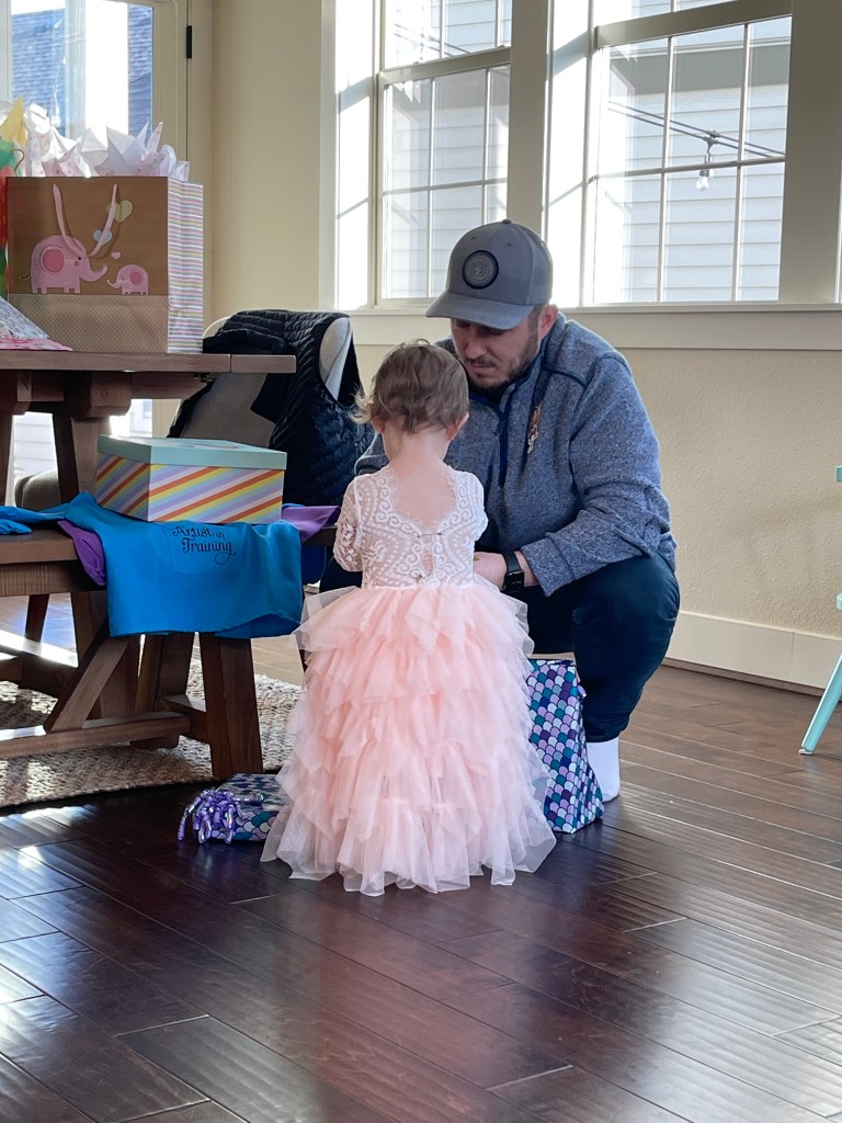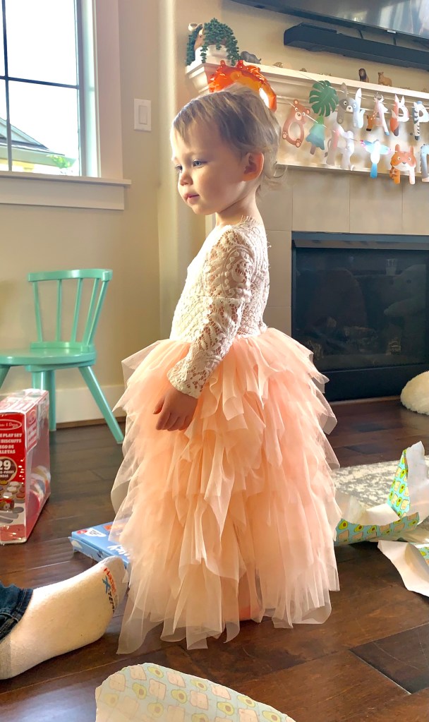 We had a blast celebrating our two year old and enjoyed spending the time with our close family. Our little princess was the star of the party and her beautiful dress from Amazon lived up to the task. I ordered it in a 2T and had to safety pin the back to keep it from falling off her shoulders. If I had more time, I would have ordered a 12 month size and I think it would have fit better but this one did the job.