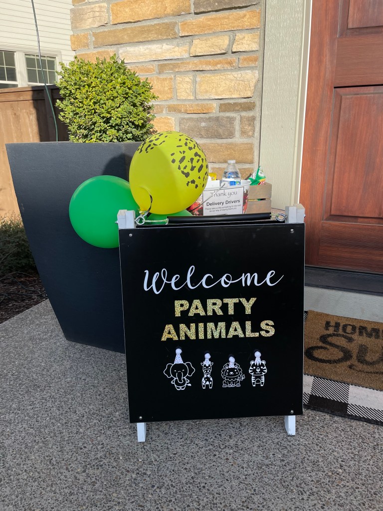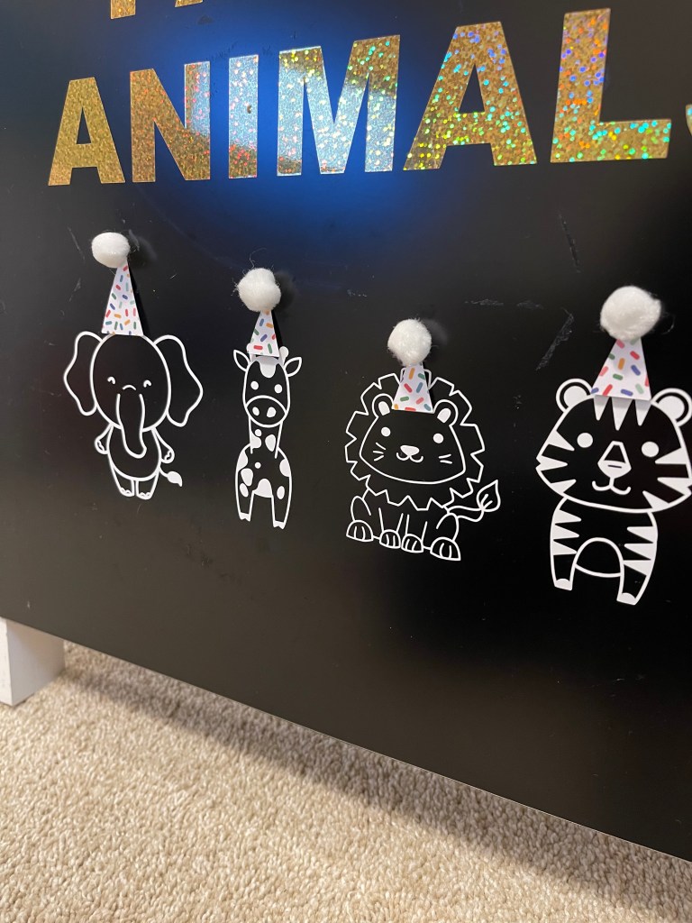 We have a small black A-Frame I attached removable vinyl on that said, “Welcome Party Animals”. I decided it needed a little extra pizzaz so I also cut out small animals in white vinyl, mini party hats from card stock and attached mini Pom Poms to finish it off. It sat at the front door to welcome the guests and was a cute photo prop for our little Wild Child.