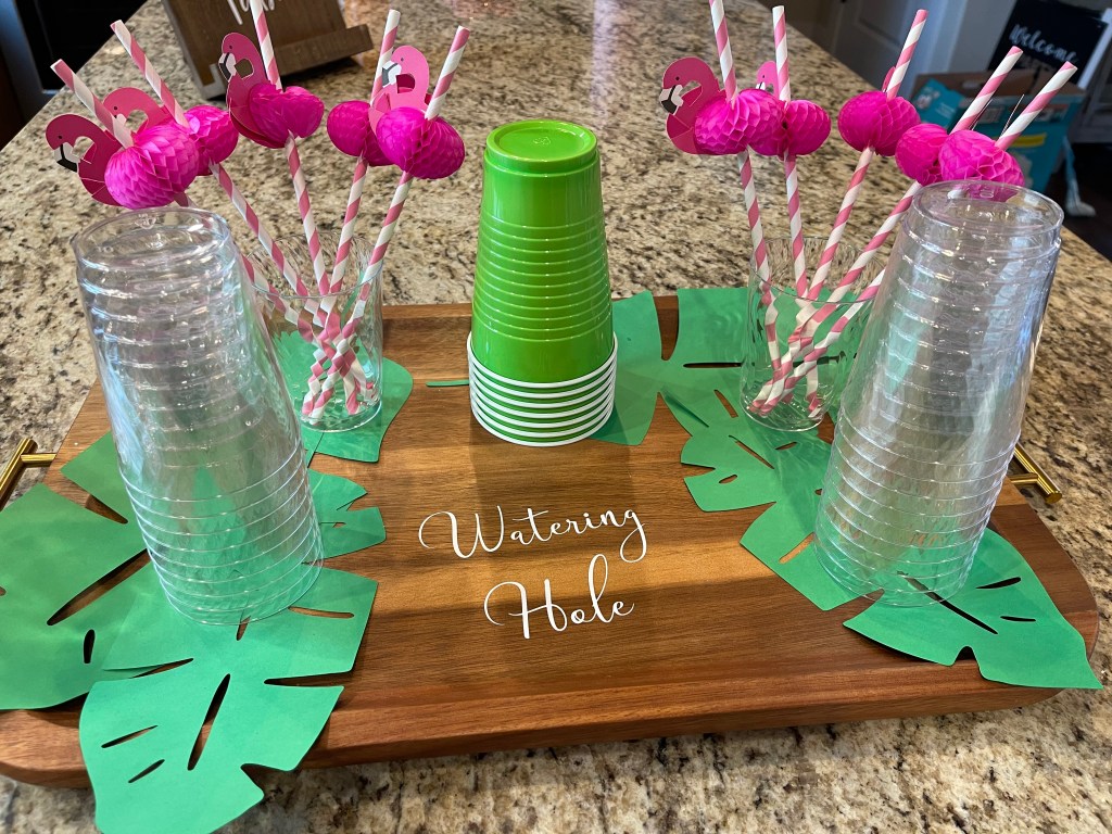 I served ice water and lemonade with these cute flamingo straws I have had in my party supplies and never had a chance to use before. I added more of my Cricut cut leaves and cut the “watering hole” from white removable vinyl (can you tell I love this material?!).