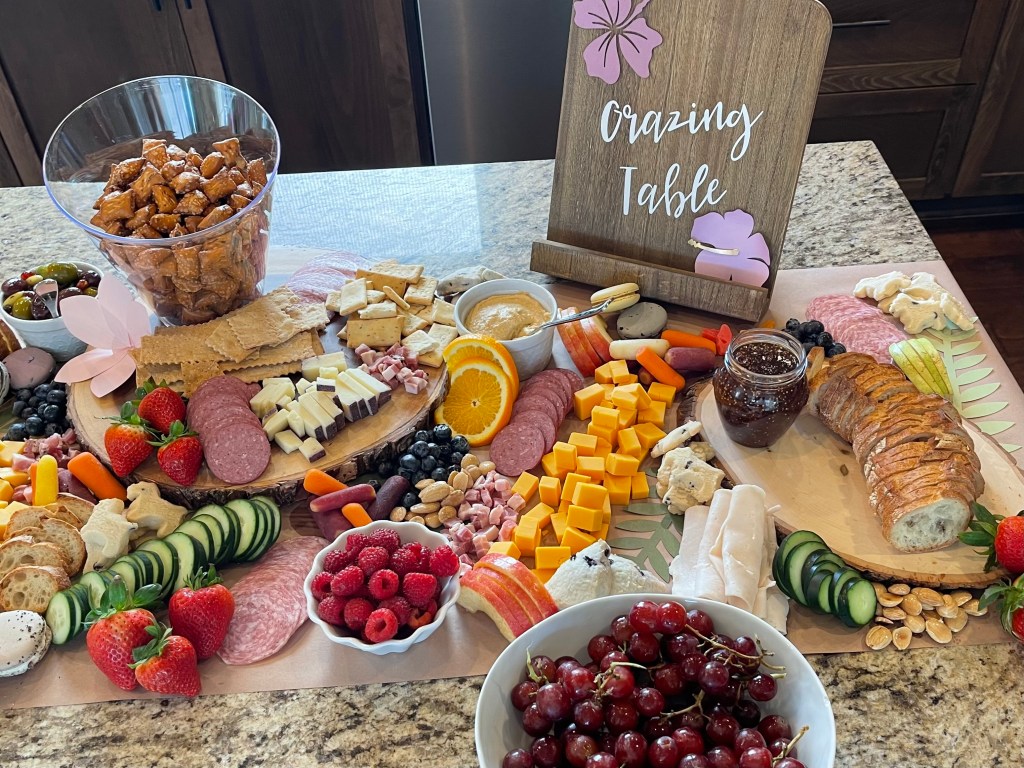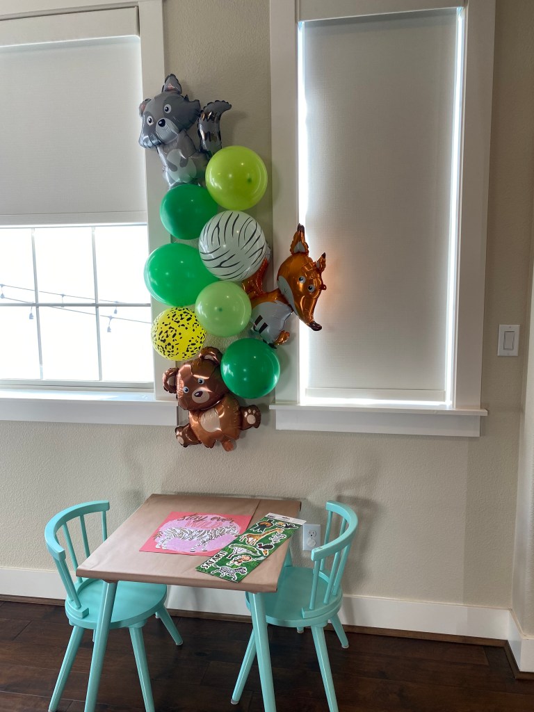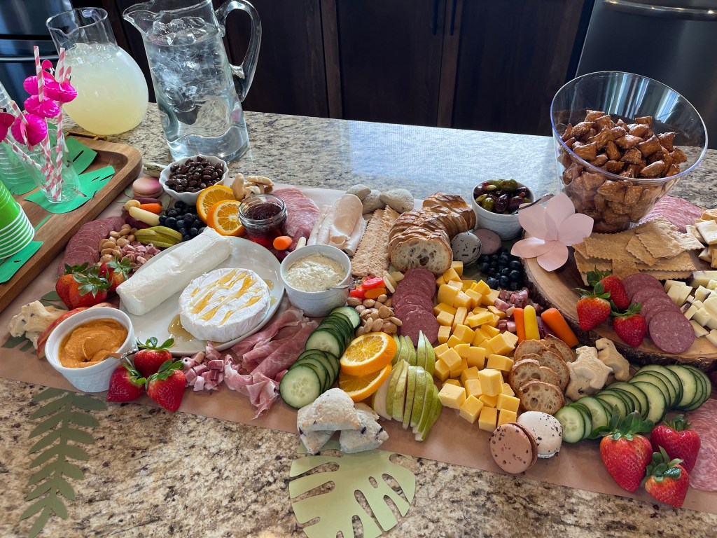 Food: I opted for a crazing table to continue the animal theme! I laid out craft paper on my kitchen island, placed some wooden rounds, white plates and serving containers around on it and just started placing food items in places I thought it looked good at. I did try to place like items on the board at one time so they were spaced well. For instance, I started with crackers and bread, moved on to meats and cheeses, then filled in with the fruits, veggies and treats. The “Grazing Table” sign was made using a cookbook stand I believe I got at Hobby Lobby years ago, white vinyl for the lettering cut on my Cricut and the tropical flowers were also found on my Cricut design space and cut from different shades of purple card stock.