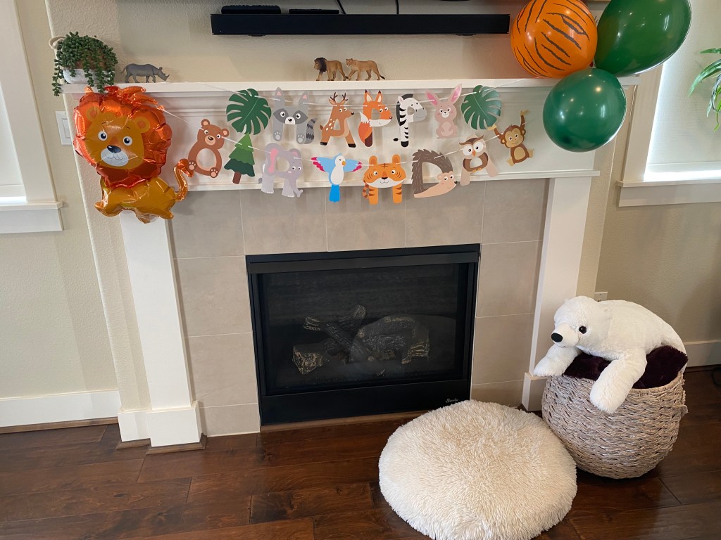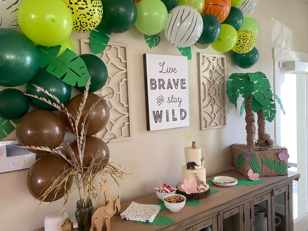 Decor: I ordered the Happy Birthday banner and balloons for the arch from Amazon and was happy with the results. I can’t find them in my order history but these are similar styles; banner and balloons. I use this balloon inflation machine whenever I have a balloon arch to put up. The animal figurines are from Dollar Tree and Hobby Lobby. The quality at Hobby Lobby was a lot better than the Dollar Tree finds but they also cost about $8 each so I had to pick and choose what looked presentable in the cheaper options. Dollar Tree also had unfinished, wooden animal figures. I ended up with a giraffe, elephant and rhino that I spray painted gold (you can spot them in the bottom left of the 2nd picture below). The “Live Brave and Stay Wild” wall decor was also a Hobby Lobby find that is now in my daughters bedroom.