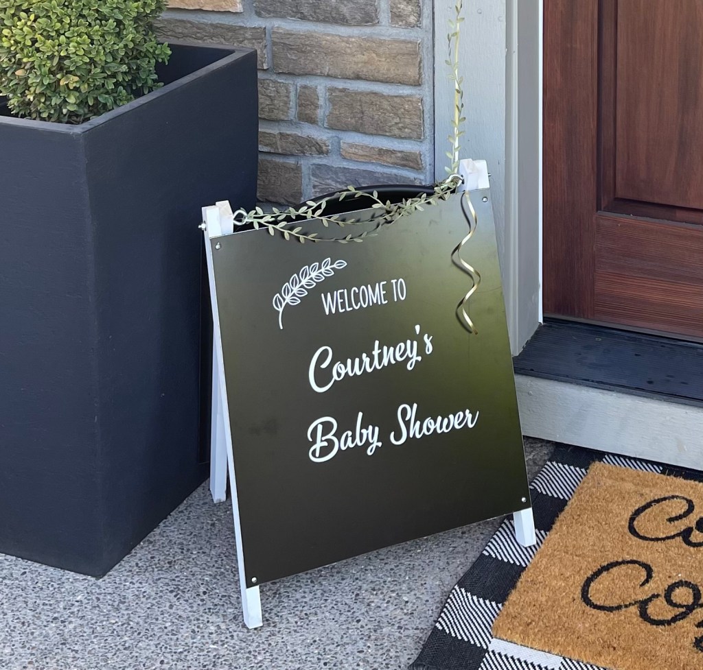 I have an A-Frame sign I typically use at the front door and for this particular party, I added white vinyl lettering that says, “Welcome to Courtney’s Baby Shower” and set it at the front door. I decided to add a large white balloon to draw more attention to it and that turned out to be a bit of a hassle. With the price of helium, our local grocery store floral department quoted us $100 for the one balloon!! Due to this, I decided to fill it up with my balloon pump and stuck it to the side of the door with tape. It was a windy day so it didn’t stay up very long but my husband was on balloon duty until the party started!