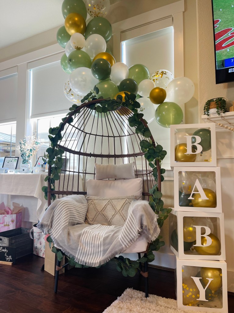 I brought in my outdoor egg chair and dressed it up with some fake eucalyptus leaves my sister had from her wedding. This was the perfect spot for the mom-to-be to sit and open gifts. To make her more comfortable, I included a lumbar pillow and blanket. I added a semi balloon arch above using this 60 piece balloon set. I also put a few in these cute BABY boxes, just fill them up super tiny and you can mix and match four of them.