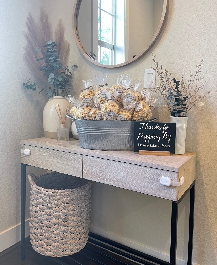 My sister requested Miss Hannah’s Gourmet Popcorn for her favors. They are a local gourmet popcorn shop in our area. The individual bags are pretty speedy so we decided to buy 4 and split them between cellophane bags with these cute stickers on them. I used my Cricut to cut vinyl lettering that said, “Thanks for Popping By. Please take a favor” and attached it to a chalkboard sign I bought from Hobby Lobby.