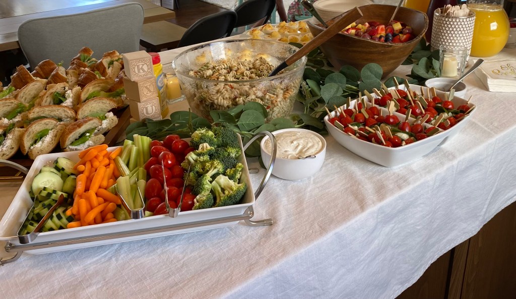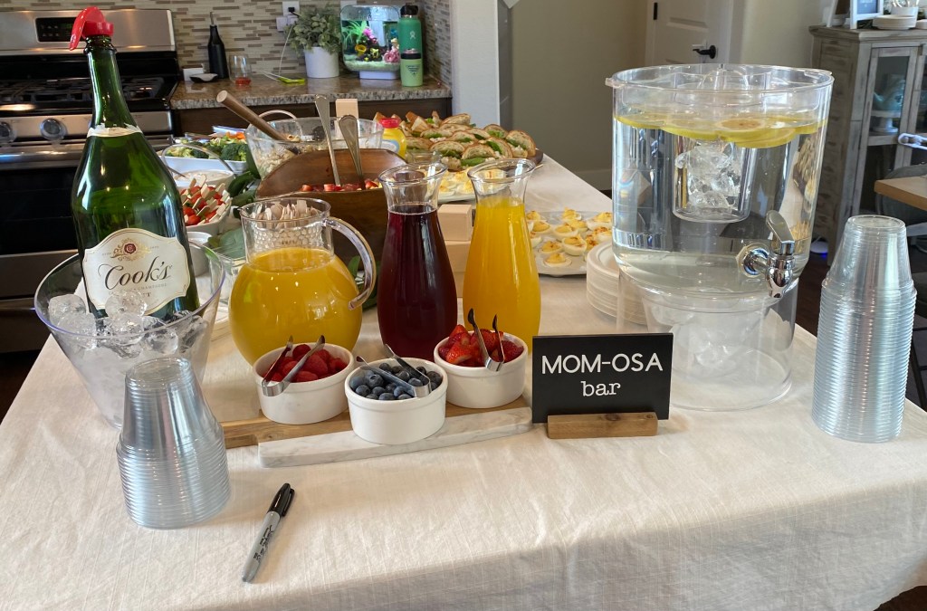 We had a Mom-osa bar with a few juice options (orange, cranberry and mango), Champagne and assorted fruit. I made the Mom-osa bar sign using my Cricut but you can also find some cute templates online.