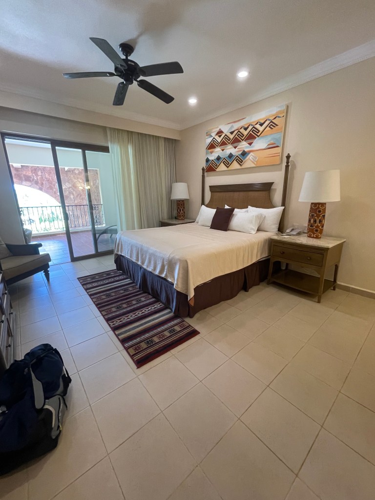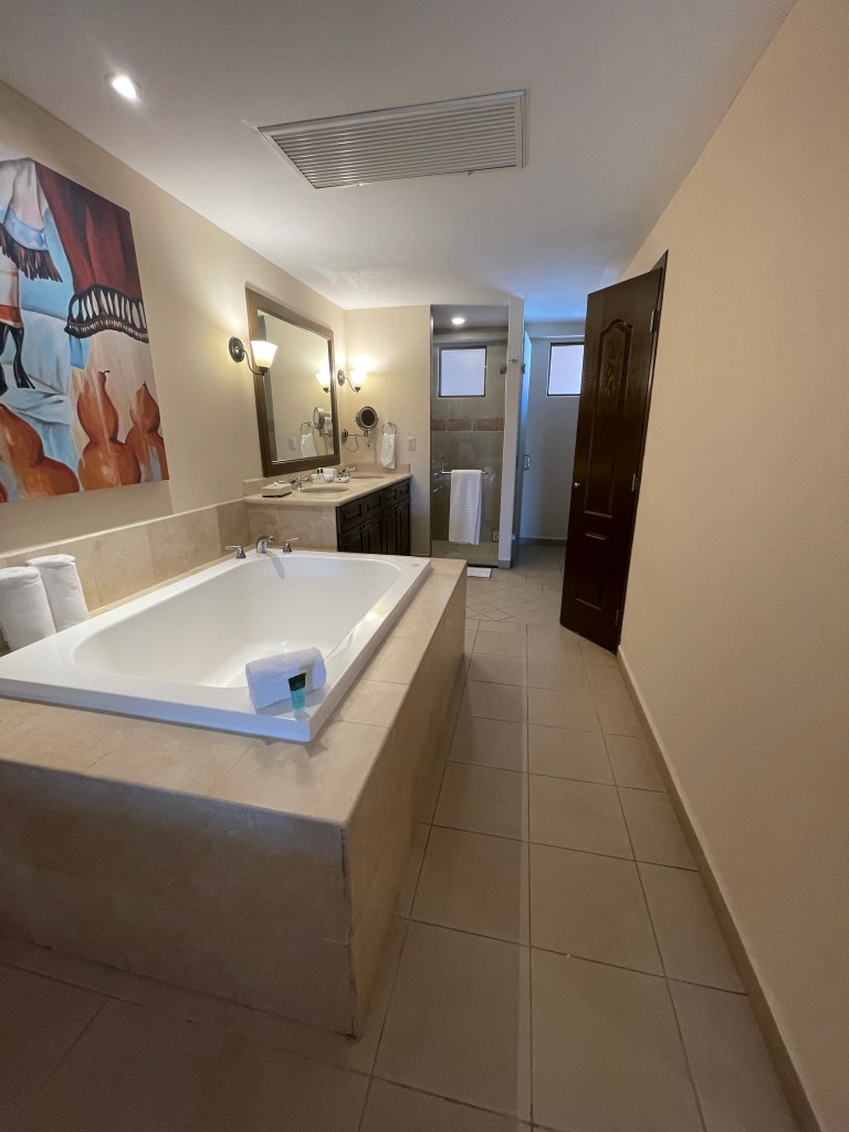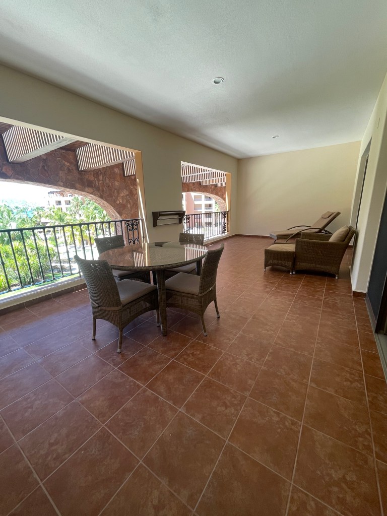 During our stay at Villa del Palmar Loreto, we took advantage of a discounted promotion which afforded us a spacious One Bedroom Suite. Spanning 1,300 square feet, the suite featured a separate bedroom, two full bathrooms, and a generous balcony. From our vantage point, we overlooked the main pool area with a partial view of the ocean. Remarkably, the balcony’s design cleverly mitigated any noise from the pool, thanks to an overhang from the building above (pictured on the far left).