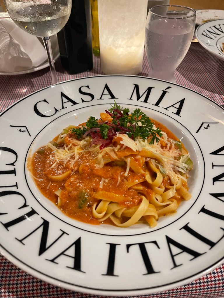 - Casa Mia, the Italian restaurant, quickly became a favorite spot. We savored a delightful dinner with wine, bruschetta for starters, two pasta dishes to share, and a delectable tiramisu for dessert. The restaurant’s proximity to the beach provided stunning views of the bay, and we cherished watching the sunset during our meal. We also enjoyed a refreshing salmon salad for lunch here.